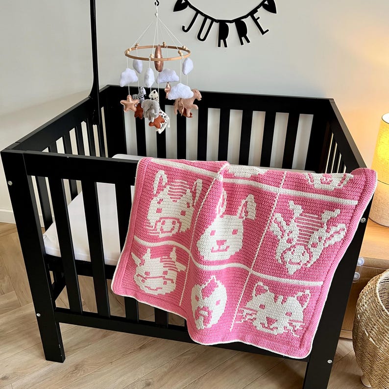 Bring cozy countryside vibes to little ones’ spaces with a charming animal-square blanket made in overlay mosaic. 🧡🐣 Each block features a friendly face (puppy, piglet, goat, lamb, bunny, pony, cow, chicken, and cat) for a playful, soothing look—perfect for nurseries, playpens, or quiet-time cuddles. ✨🧸